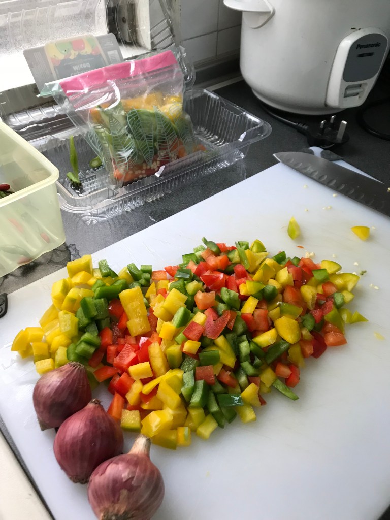 - 3 bell peppers (1 green, 1 yellow 1 red) – Diced into 1cm cubes – discard seeds and veins.