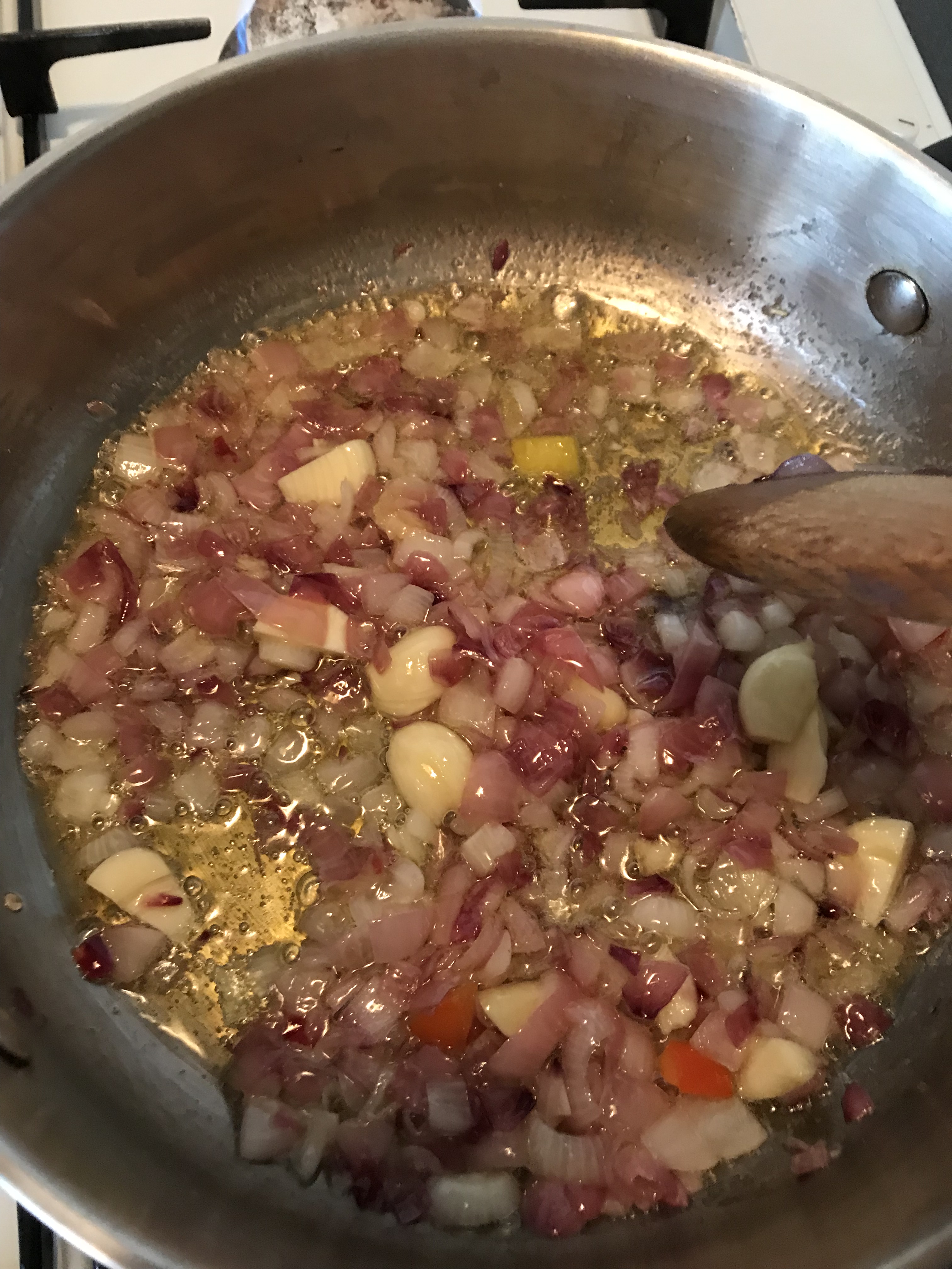 - When the shallots are translucent, increase the heat high and immediately add in your peppers and stir. (Don’t worry you won’t burn your beautiful shallots you worked so hard on. The temperature displacement from the room temperature-peppers will be enough to offset the extra heat and bring your pan quickly back to a good medium one. Otherwise you’d end up ‘slow boiling’ the peppers. You don’t want this.)Sweat the peppers as you did with the shallot, low and slow, stirring occasionally. About 10-15 minutes. (After awhile the extra head you added in step 3 will be more than enough to get things going. When this happens, turn the heat back down to medium-low).