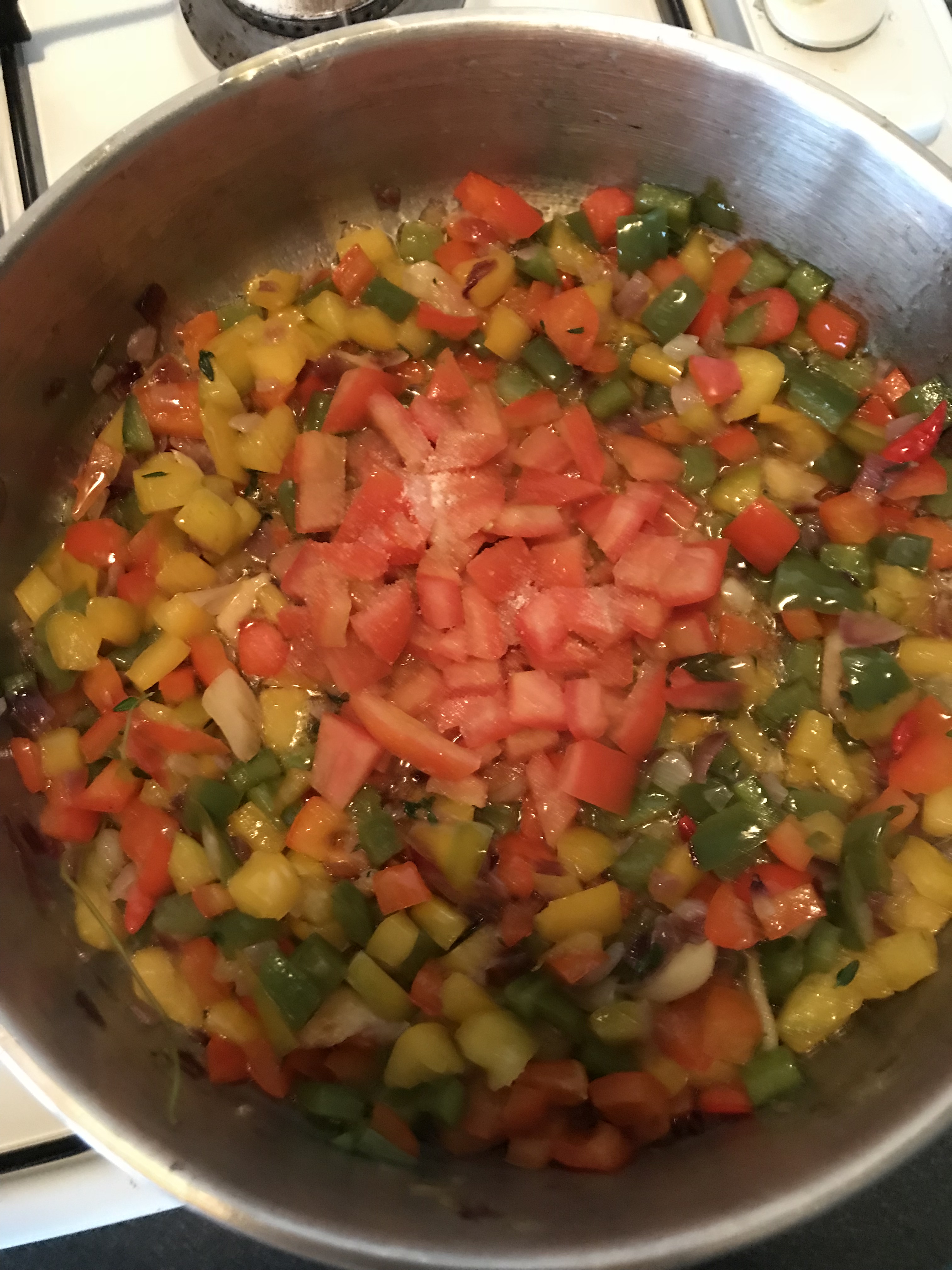 - Just when the peppers have started to get soft, but not mushy, add in the tomato. Continue to sweat everything for another 5-10 minutes until the tomato is soft but, again, not mushy.