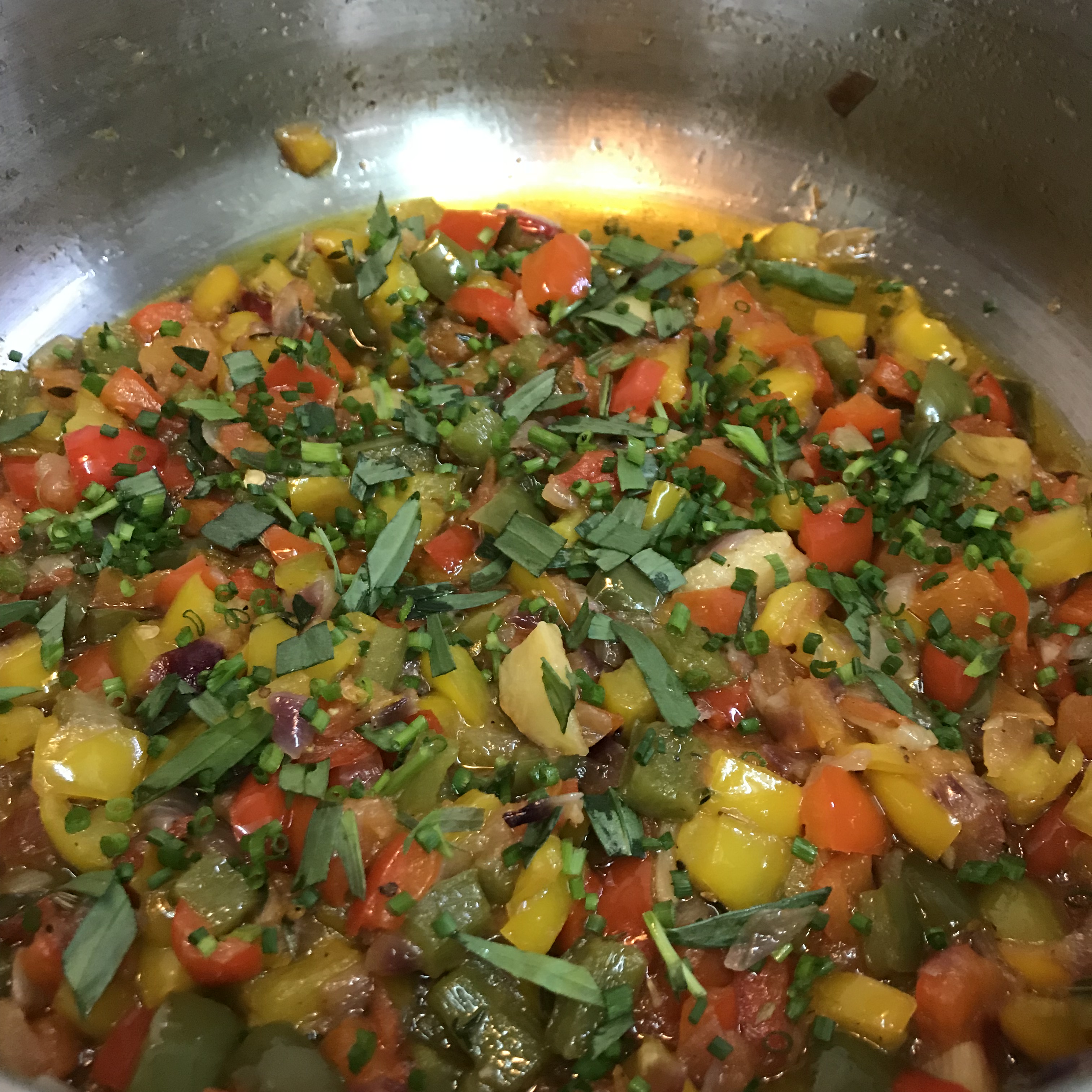 - Season the Piperade and when you’re happy with it, throw in the chives and tarragon. Drizzle over some extra virgin olive oil. Give them a stir, turn off the heat and cover. Let it sit for another 10 minutes before serving. (You can definitely eat it straight away if you’re in a rush but this last step lets everything come together nicely. You’ve already gotten this far. A little bit more won’t kill you!)