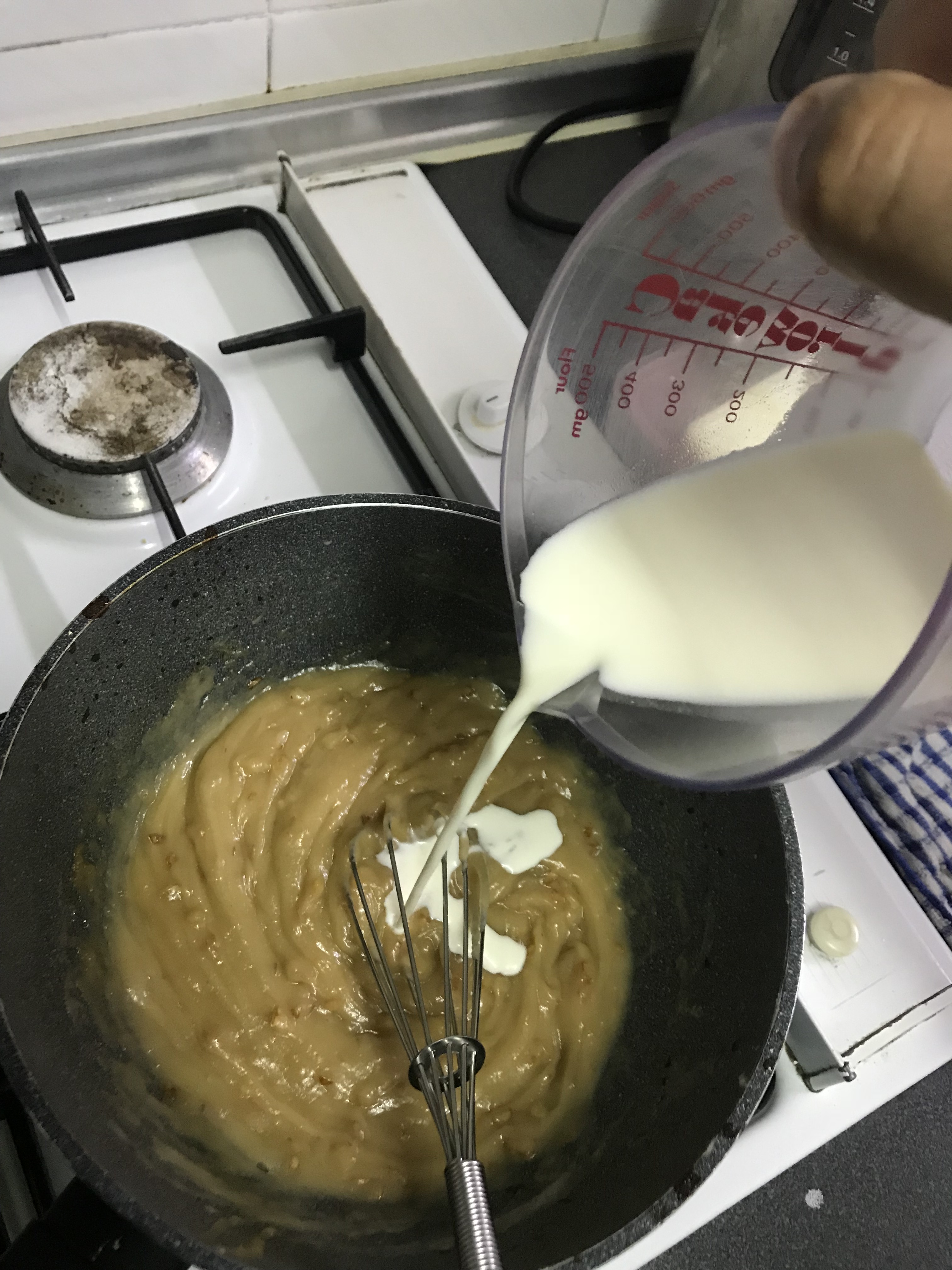 - Gently pour in 1/3 of the stock or milk, whisking slowly until everything has been incorporated and there are no lumps.