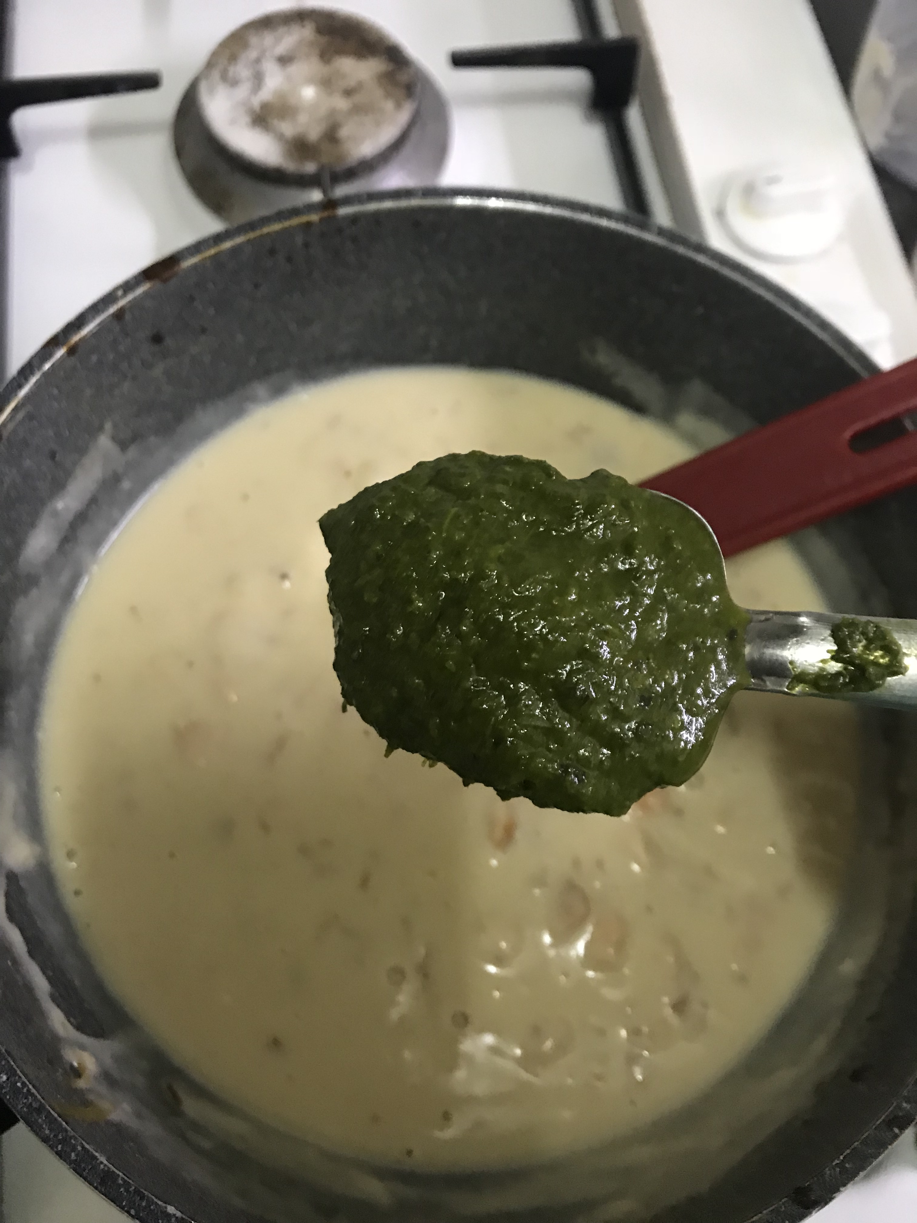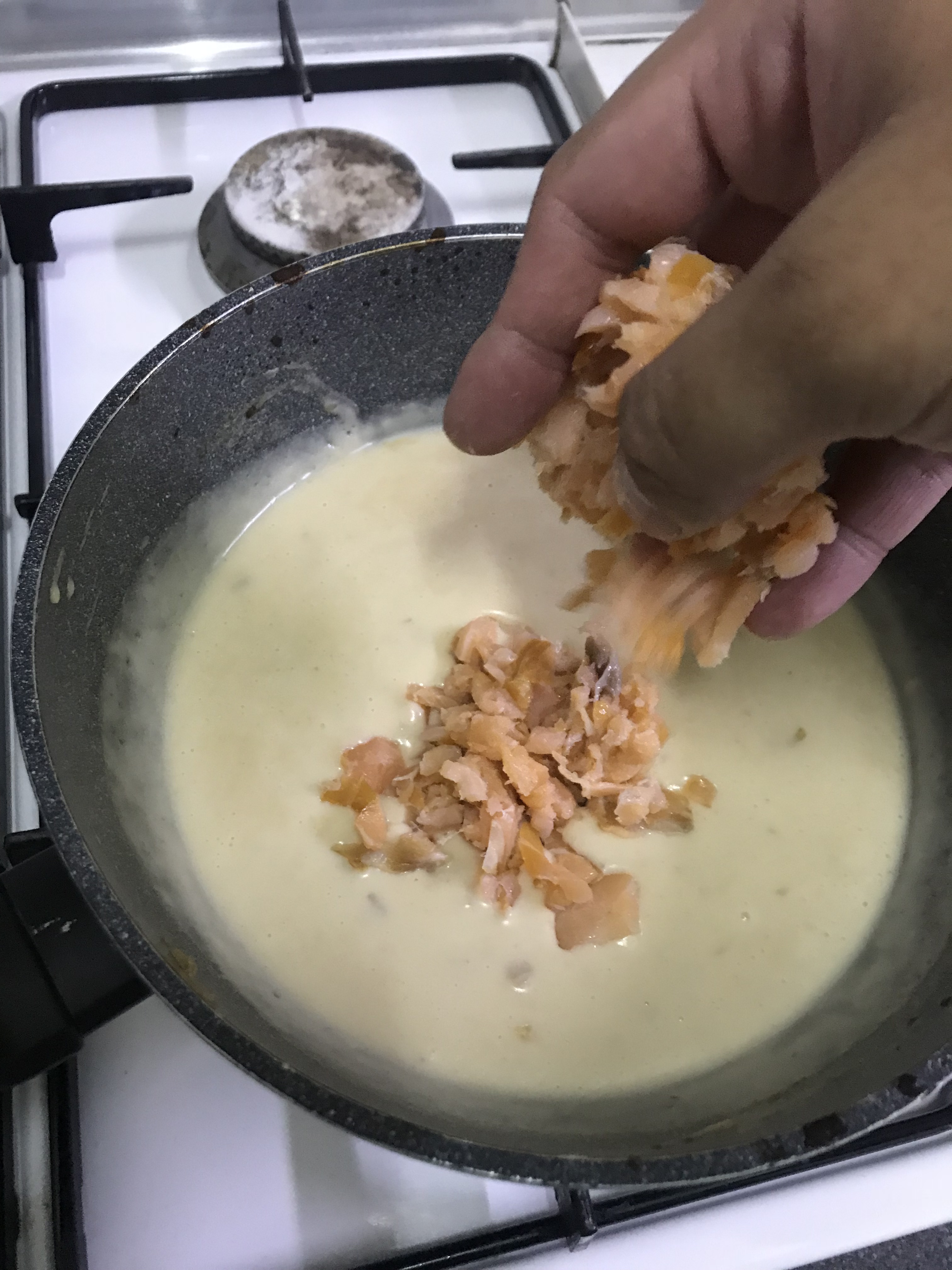 - Turn off the heat and let the mixture cool down a bit before adding the salmon. If you are using pesto, add it in during this step as well.
