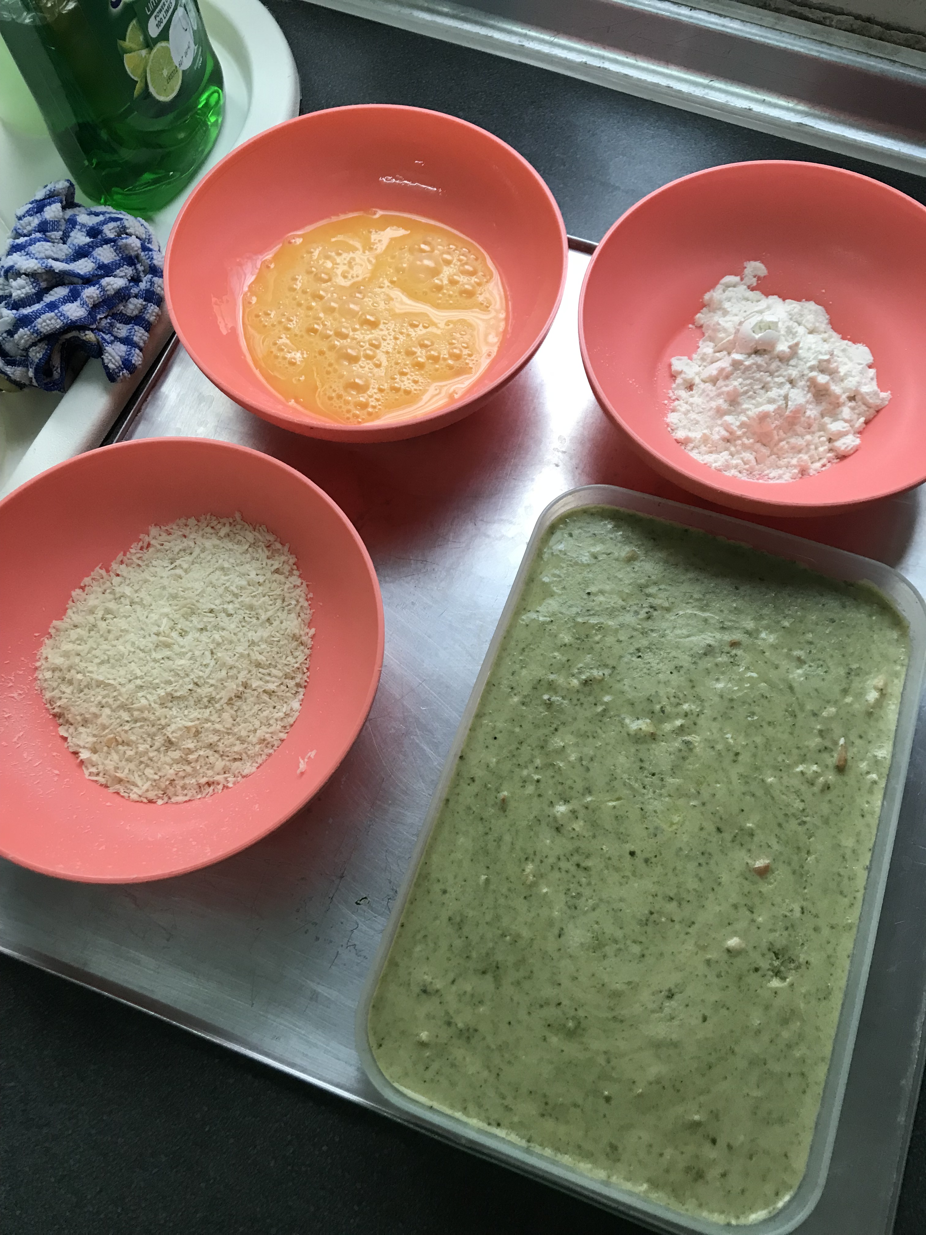 - Prepare your breading station i.e. three separate bowls for your flour, egg wash and breadcrumbs.