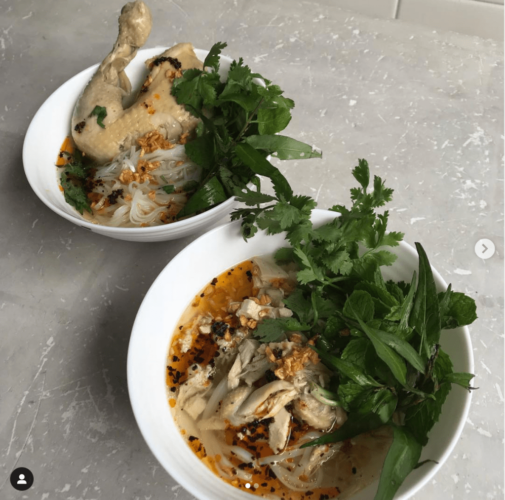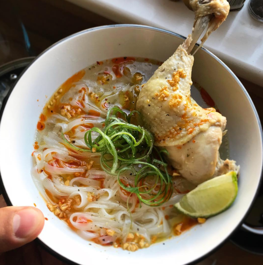 - When you are ready to serve, boil the soaked rice noodles for about 1 – 2 minutes or per the packet instructions. Place them into a bowl, put your cut chicken pieces on top, the herbs, and then pour over the hot soup. Pour garlic-chilli oil on top and crispy garlic pieces.