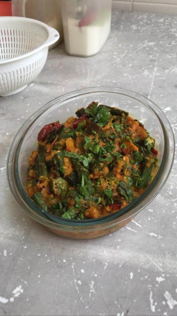 - Turn off the heat and throw in your chopped coriander. Give everything a mix and let the bendi masala sit for about 5 minutes before serving.