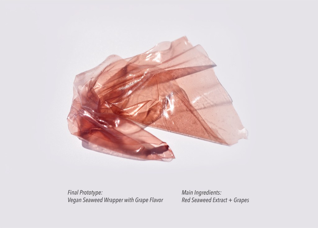 In collaboration with Jakub Radzikowski, a culinary education designer, she has since created innovative food materials from seaweed – vegan seaweed wrappers, and an online platform offering customization for its nutritions and flavors. These wrappers are 100% edible and some made into dissolvable pouches, providing additional nutritional value including polysaccharides from seaweed that may help support gut health. These wrappers come with three suggested scenarios as to how you may use Seaweed U.