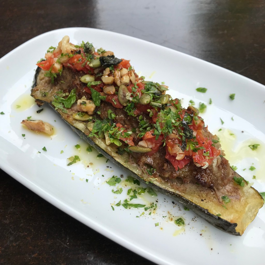 - Before serving, spoon a generous serving of the tomato concasse on each of the courgettes, and top it off with extra virgin olive oil, more lemon zest, toasted walnuts and toasted pumpkin seeds.